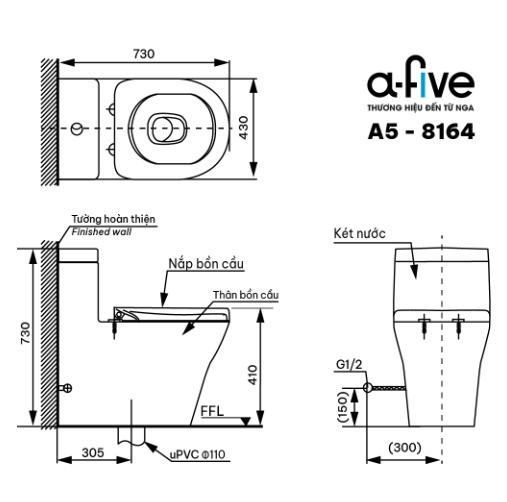 Mẫu bồn cầu khối A5-8164 đến từ thương hiệu A-Five thuộc dòng bồn cầu cao cấp với thiết kế liền khối. Việc lựa chọn nguyên liệu đầu vào khắt khe và công nghệ xử lý hoàn toàn tạp chất cho ra phôi sản phẩm đạt chất lượng cao. Sau đó, sản phẩm được nung ở nhiệt độ 1280°C cho ra lớp sứ siêu bóng mịn chống bám bẩn, kháng khuẩn giúp việc lau chùi vệ sinh dễ dàng hơn bao giờ hết. Thiết kế nguyên khối bo tròn góc cạnh mang vẻ đẹp tinh tế và hiện đại phù hợp với mọi không gian phòng tắm.