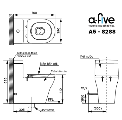 Mẫu bồn cầu khối A5-8288 đến từ thương hiệu A-Five thuộc dòng bồn cầu cao cấp với thiết kế liền khối. Việc lựa chọn nguyên liệu đầu vào khắt khe và công nghệ xử lý hoàn toàn tạp chất cho ra phôi sản phẩm đạt chất lượng cao. Sau đó, sản phẩm được nung ở nhiệt độ 1280°C cho ra lớp sứ siêu bóng mịn chống bám bẩn, kháng khuẩn giúp việc lau chùi vệ sinh dễ dàng hơn bao giờ hết. Thiết kế nguyên khối bo tròn góc cạnh mang vẻ đẹp tinh tế và hiện đại phù hợp với mọi không gian phòng tắm.